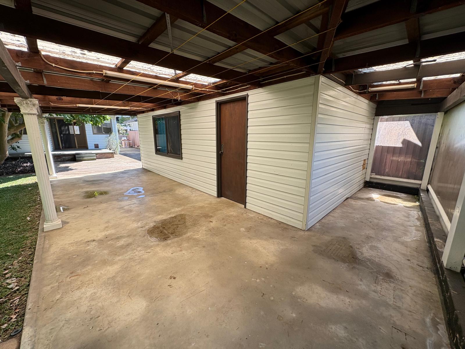 It has a carport and driveway for multiple cars.