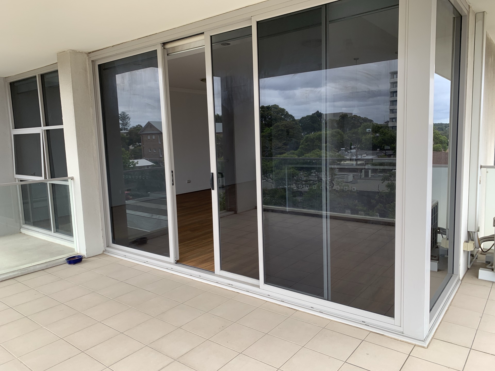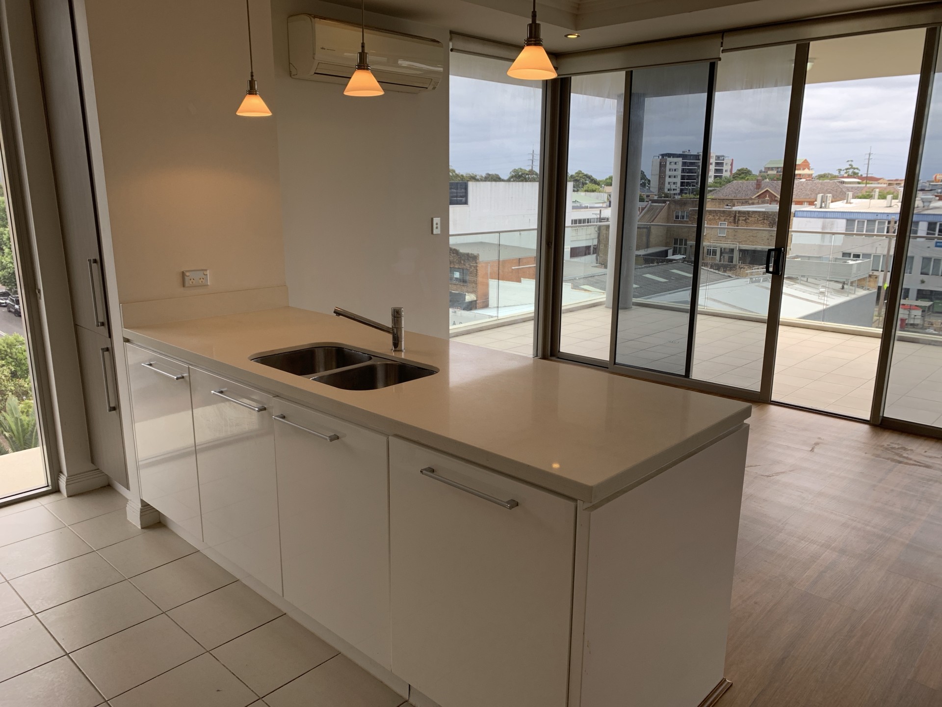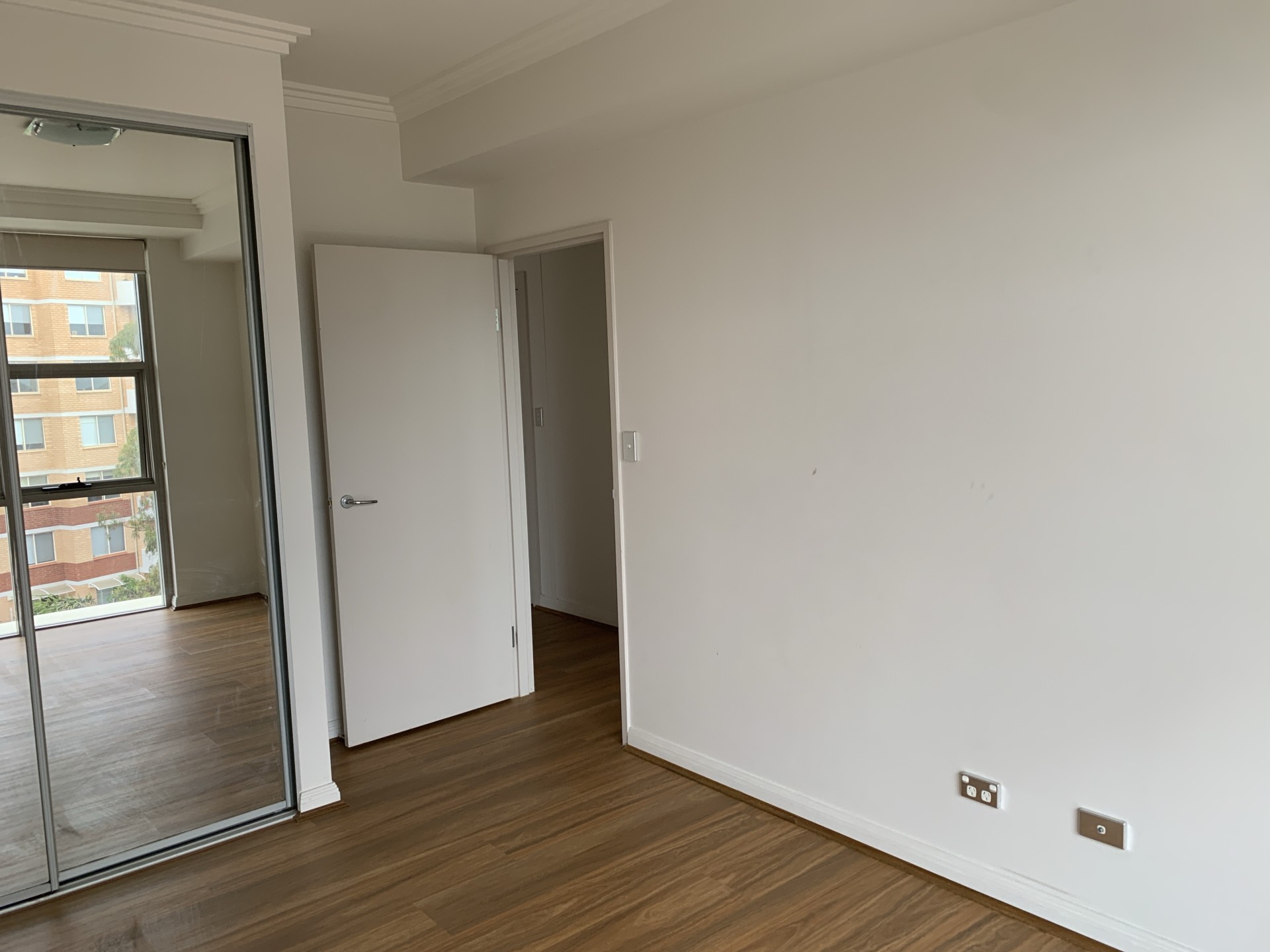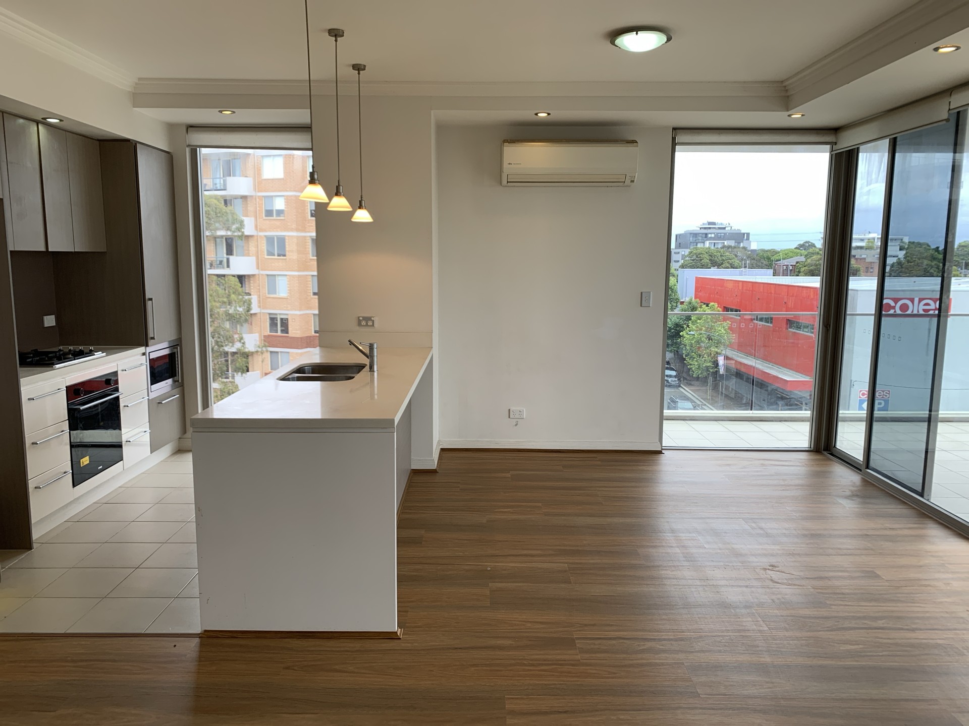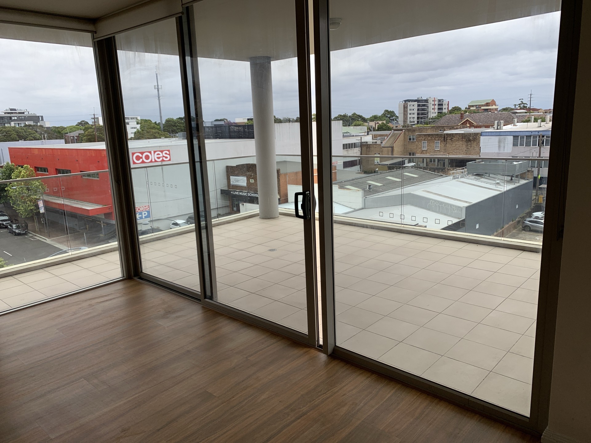 Large hallway entry leading to a sunny open-plan living area and a large balcony.
