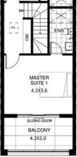 Large master bedroom, ensuite, balcony, shared living space.